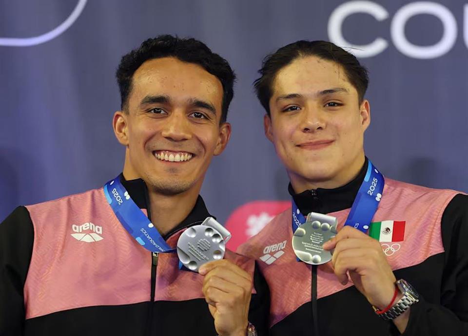 Osmar Olvera y Juan Celaya, clavadistas que representan a Nuevo León en competencias nacionales e internacionales, se hicieron de la medalla de plata en la prueba sincronizada de tres metros de la Copa del Mundo de Clavados en Montreal, Canadá