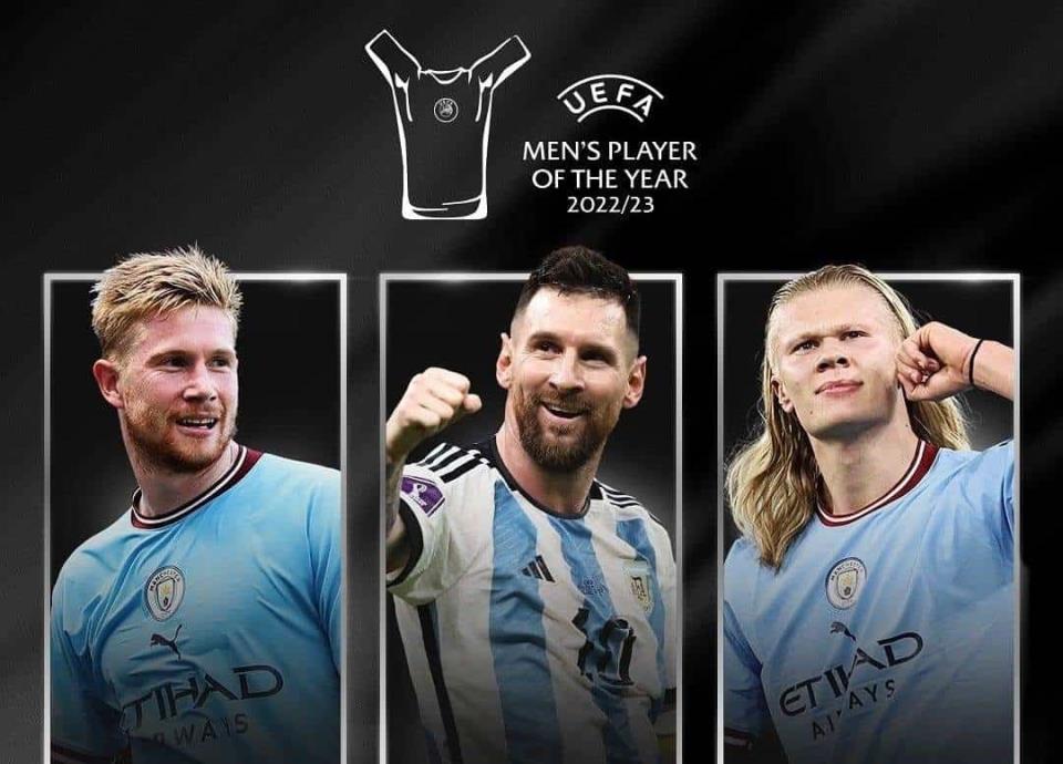 Messi, quien jugó la temporada 2022-2023 en el París Saint Germain, se hizo acreedor a esta terna gracias a que ganó el Mundial de Qatar 2022, mientras que Eerling Haaland y Kevin de Bruyne por haber ganado con el City el triplete de la campaña anterior entre FA Cup, Premier League y Champions.