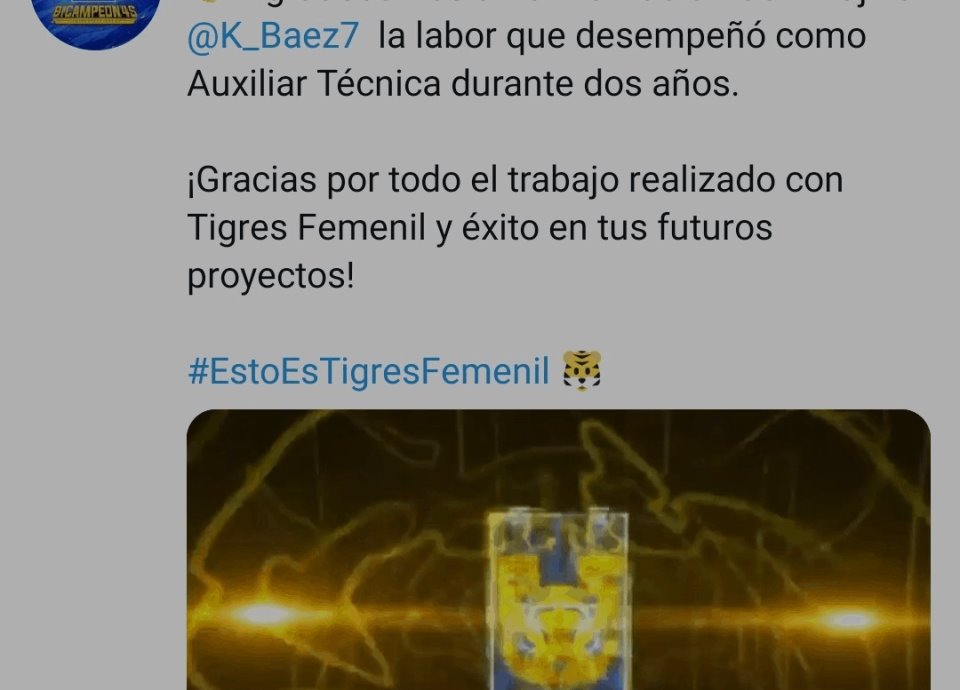 "Agradecemos a Karina Paola Báez Trujillo @K_Baez7 la labor que desempeñó como Auxiliar Técnica durante dos años. ¡Gracias por todo el trabajo realizado con Tigres Femenil y éxito en tus futuros proyectos!", destacaron en sus redes sociales.