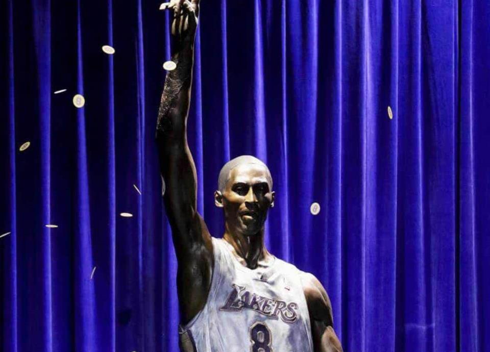 La estatua de cuatro mil libras y 19 pies fue de bronce y representa a Kobe Bryant con la camiseta blanca número ocho