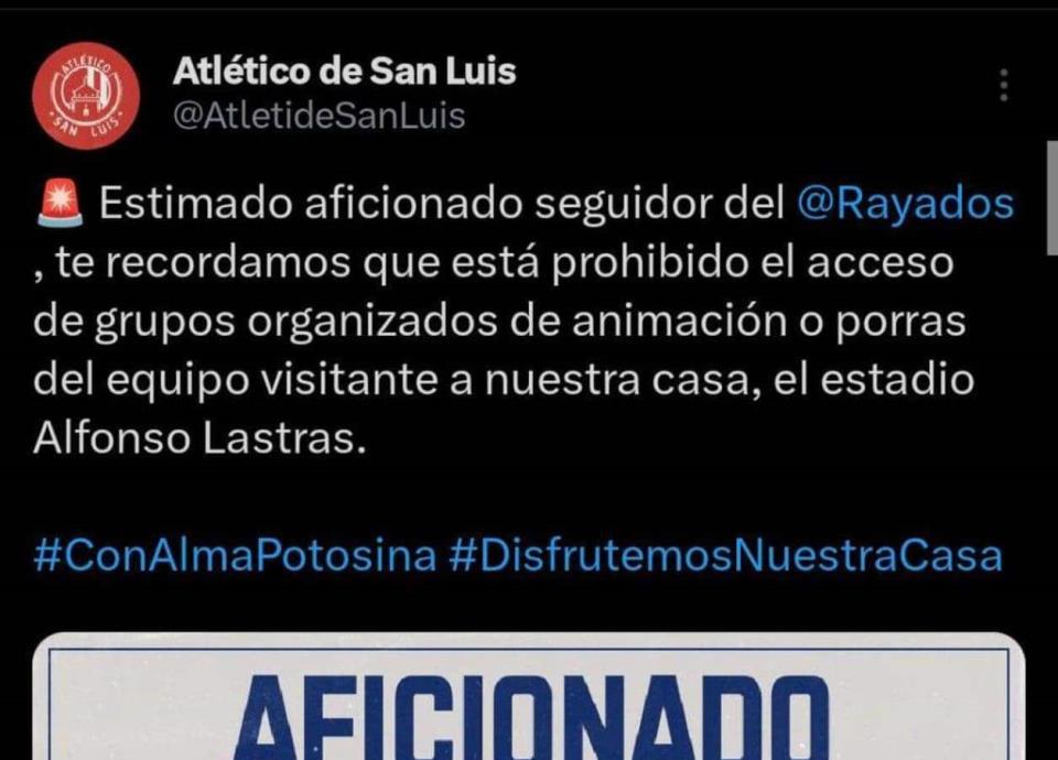 "Estimado aficionado seguidor del @Rayados, te recordamos que está prohibido el acceso de grupos organizados de animación o porras del equipo visitante a nuestra casa, el estadio Alfonso Lastras", informaron.