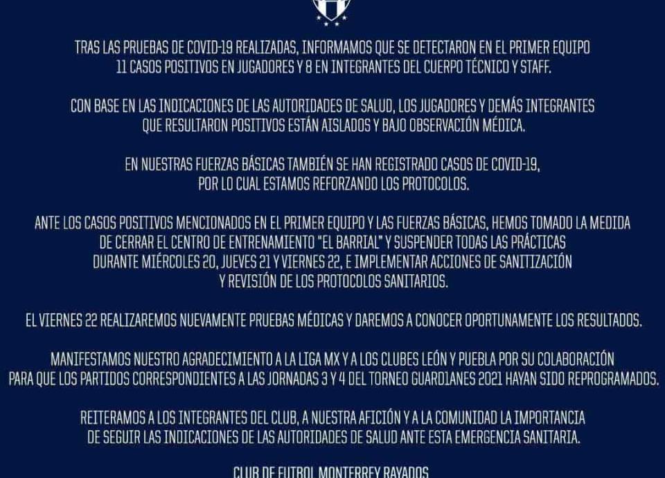 "Ante los casos mencionados en el primer equipo y las fuerzas básicas, hemos tomado la medida de cerrar el centro de entrenamiento "El Barrial" y suspender todas las prácticas durante miércoles 20, jueves 21 y viernes 22, e implementar acciones de sanitización y revisión de los protocolos sanitarios", informó Rayados.