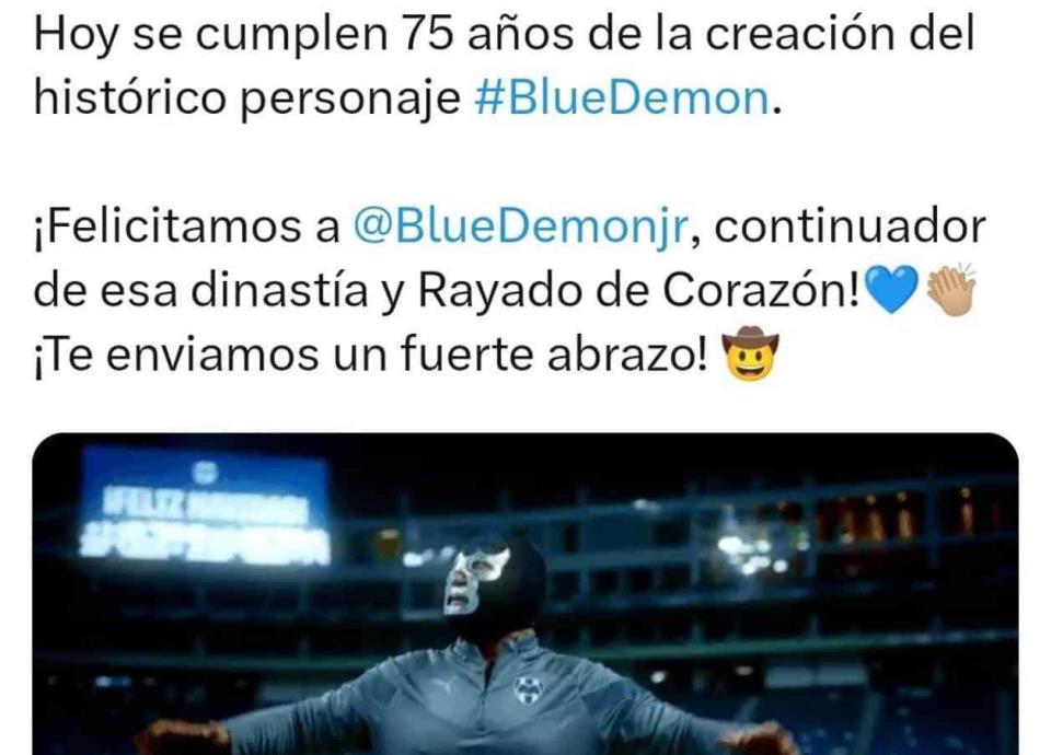 "Hoy se cumplen 75 años de la creación del histórico personaje #BlueDemon. ¡Felicitamos a @BlueDemonjr, continuador de esa dinastía y Rayado de Corazón! ¡Te enviamos un fuerte abrazo!" twitteó Rayados.