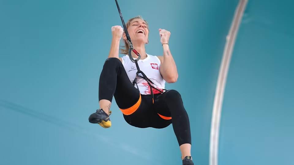 Aleksandra Miroslaw, de Polonia, rompió dos veces su propio récord mundial de escalada deportiva en la prueba de velocidad femenina en los Juegos Olímpicos de París este lunes.