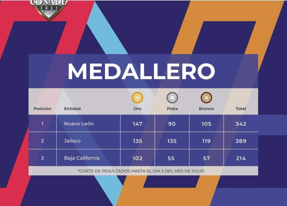 Jalisco, por su parte, es segunda en el medallero de los Nacionales Conade luego de que tengan un total de 389 medallas, siendo que de ese número de preseas logradas, solo 135 sean de oro, 135 de plata y 119 de bronce.
