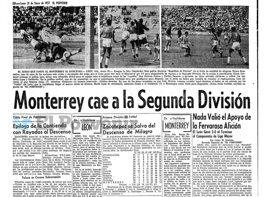 Hoy se cumplen 69 años del día en que el Club de Fútbol Monterrey vivió uno de los momentos más amargos de su historia, el descenso a la Segunda División, ocurrido el 20 de enero de 1957.