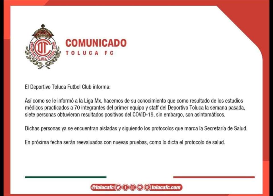 "El Club realizó 70 pruebas de detección de COVID-19 en los pasados días a jugadores, cuerpo técnico y staff del primer equipo. Siete personas obtuvieron resultados positivos, sin embargo, se trata de casos asintomáticos", publicó la Liga MX