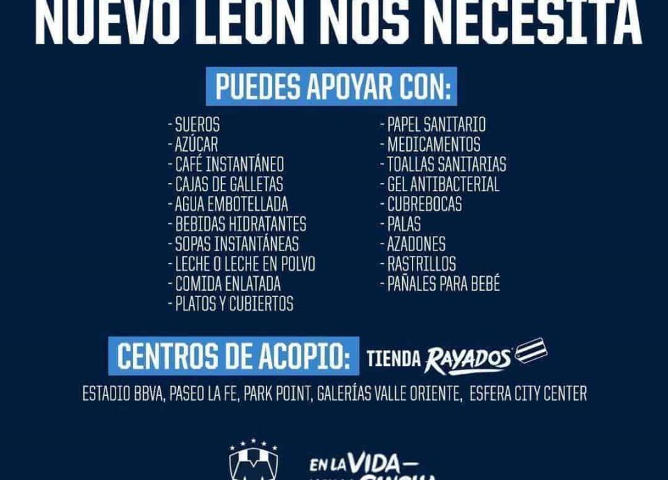 El Club de Futbol Monterrey informó en sus redes sociales el que pondrán a disposición sus Tiendas Rayados como centros de acopio.