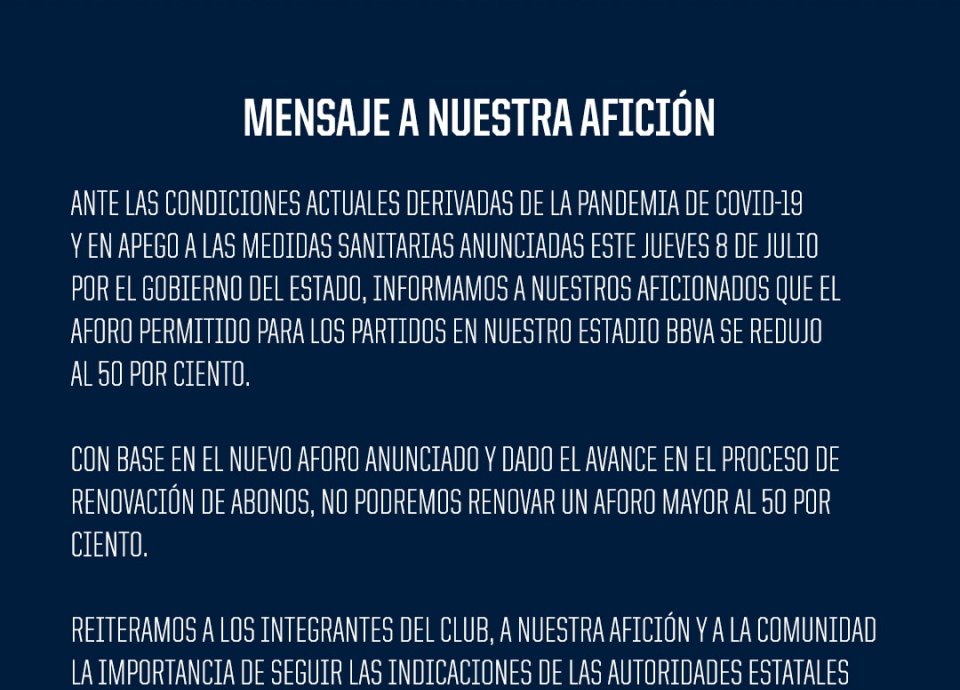 Rayados, por su parte, siguió por la misma línea e informaron que “no se podrá renovar en un aforo mayor al 50 por ciento” tras las directrices de las autoridades de salud.