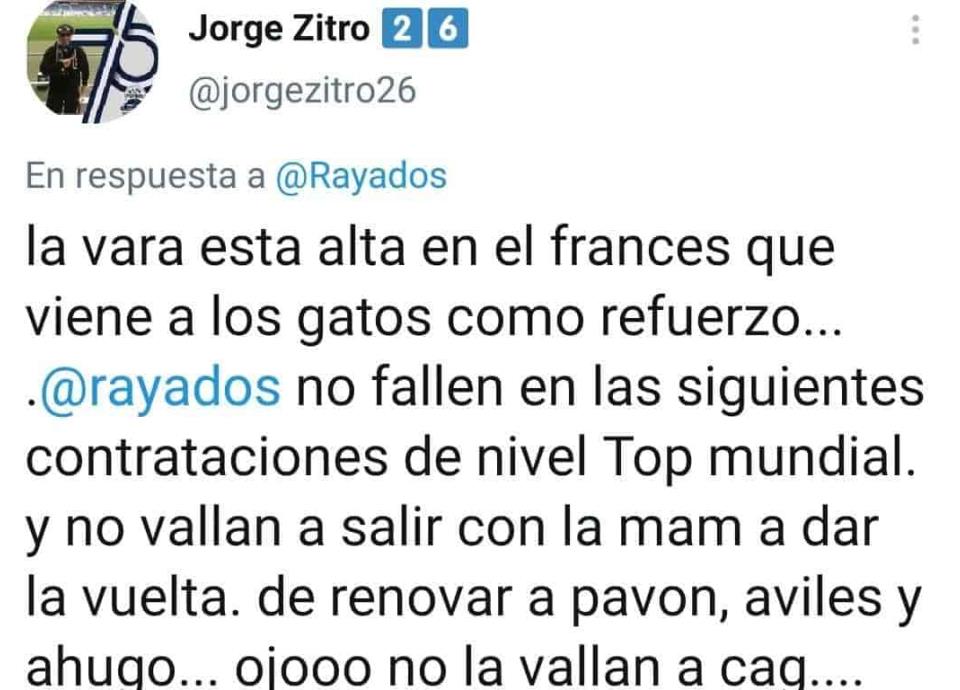 "Quiero al @aguerosergiokun y a Draxler", "Para que vean como se debe de fichar y nos dejen de picar los ojos con Janssen, que fue anunciado con bombo y platillo como la nueva estrella del equipo y la liga y no lleva ni 25 goles en casi 3 años", "Al chile CM deja de publicar, ahorita no es el timing adecuado. El de enfrente dándonos cátedra en contrataciones y aquí renovando al muerto de Aviles, trayendo de nuevo al puñ.... de Hugo y contrataciones chafas como Aké Loba", "La vara está alta en el francés que viene a los gatos (Tigres) como refuerzo....@Rayados no fallen en las siguientes contrataciones de nivel Top Mundial y no vayan a salir con renovar a Pabon, Avilés y a Hugo... Ojo, no la vayan a cag...."