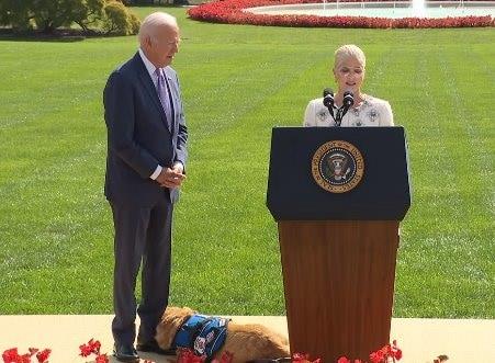 Blair, a quien le diagnosticaron esclerosis múltiple en 2018, caminó junto con Biden a una ceremonia en el jardín sur de la Casa Blanca con su bastón y su perro de servicio, un labrador inglés llamado Scout.
