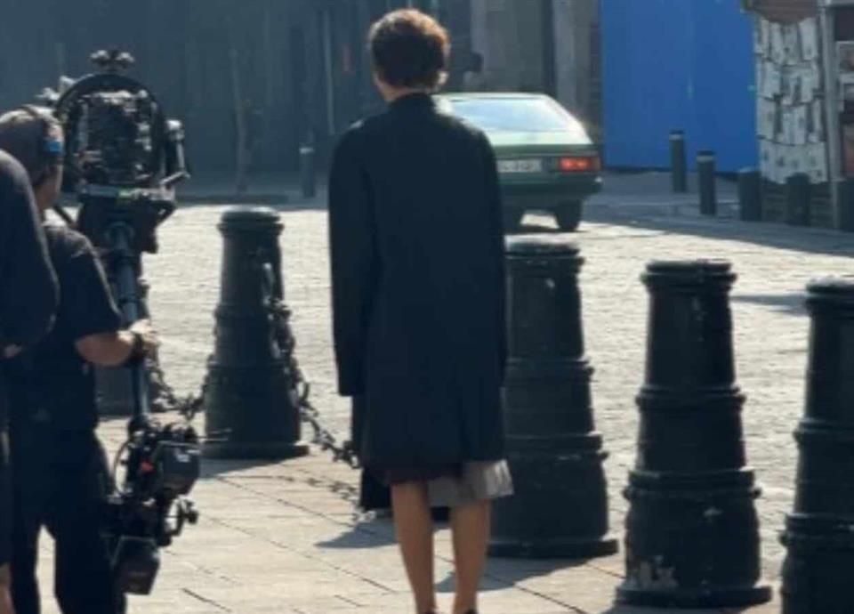 En las publicaciones se observa a la actriz con un top, falda larga y saco negro; además de estar rodeada por varios camarógrafos y un equipo de producción.