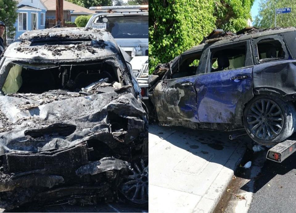 El Mini Cooper azul de Heche, completamente destrozado y en cenizas, siendo remolcado por bomberos, así como un video de una cámara de seguridad que muestra momentos antes a la actriz conduciendo su auto a alta velocidad, son algunas de las imágenes reveladas este jueves.
