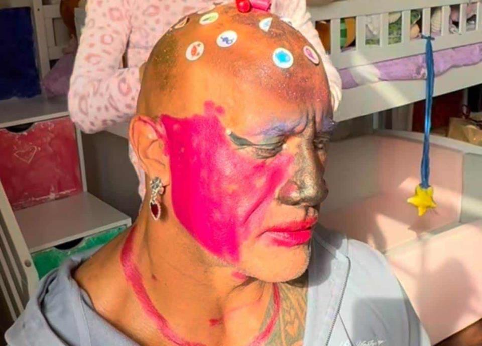 A través de un video publicado en sus redes sociales, ‘La Roca’ mostró su cara pintada de rosa y negro mientras sus hijas ríen y se divierten colocándole todo tipo de objetos sobre la cabeza.