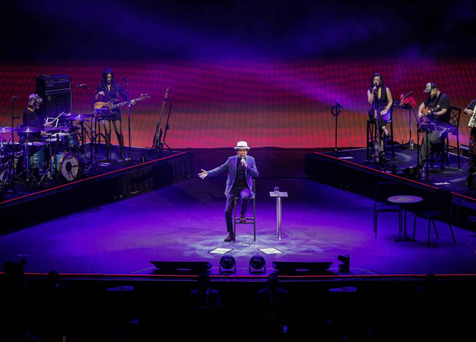 Mientras comparte anécdotas de su carrera, señala: "siempre fui muy consciente de que mi garganta no era uno de los mejores instrumentos", pero el público demuestra lo contrario cada que se emociona con un nuevo tema que él y sus músicos interpretan a lo largo de una veintena de canciones que integran el setlist.