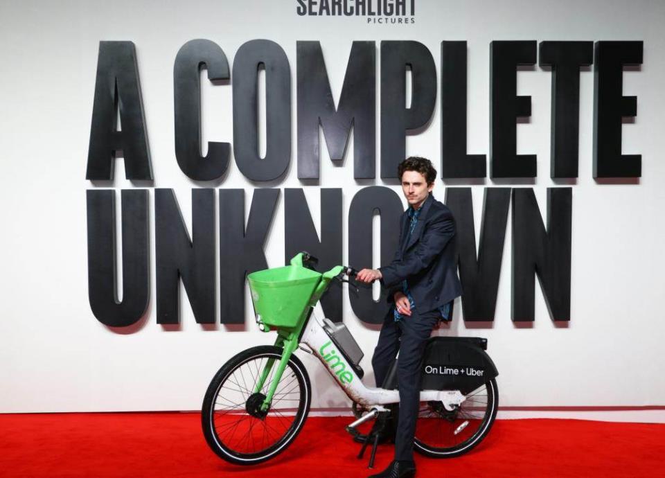 En la alfombra roja de su nueva película “Un completo desconocido”, Timothée Chalamet fue multado por llegar en bicicleta