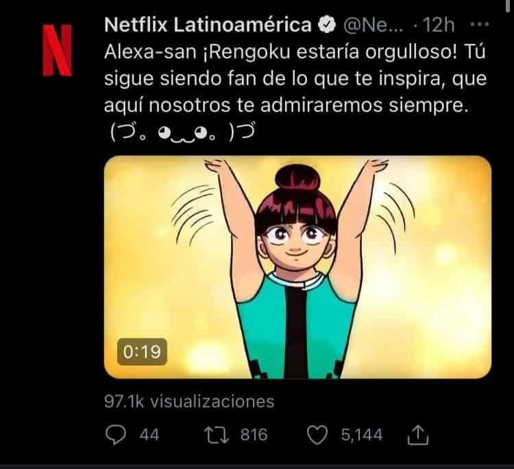 “Alexa-san ¡Rengoku estaría orgulloso! Tú sigue siendo fan de lo que te inspira, que aquí nosotros te admiraremos siempre”, se puede leer en las redes sociales de Netflix junto a la animación en la que se ve a la gimnasta convertida en un personaje de anime realizando espectaculares saltos y concluye con la frase: “Una hashira (pilar) tan hábil como Tanjiro y tan veloz como Zenitsu”, refiriéndose a personajes de Demon Slayer.