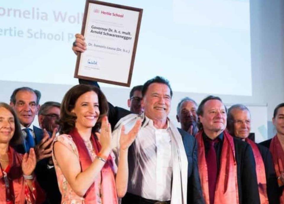 Cornelia Woll, presidenta de la Universidad Hertie, mencionó durante la ceremonia que el exgobernador Schwarzenegger fue factor para que se firmara la Global Warning Solutions Act en 2006, la cual comprometía al estado de California a reducir las emisiones de gases de efecto invernadero.