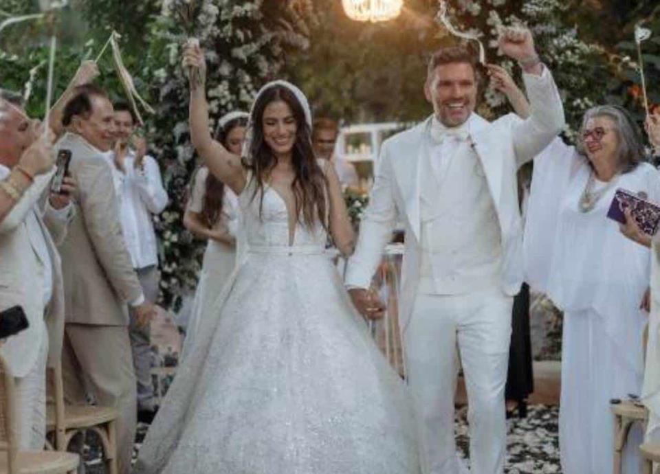 Valeria deslumbró con un vestido blanco diseñado por Benito Santos, mientras que Julián optó por un elegante traje blanco, a juego con el de su ahora esposa.