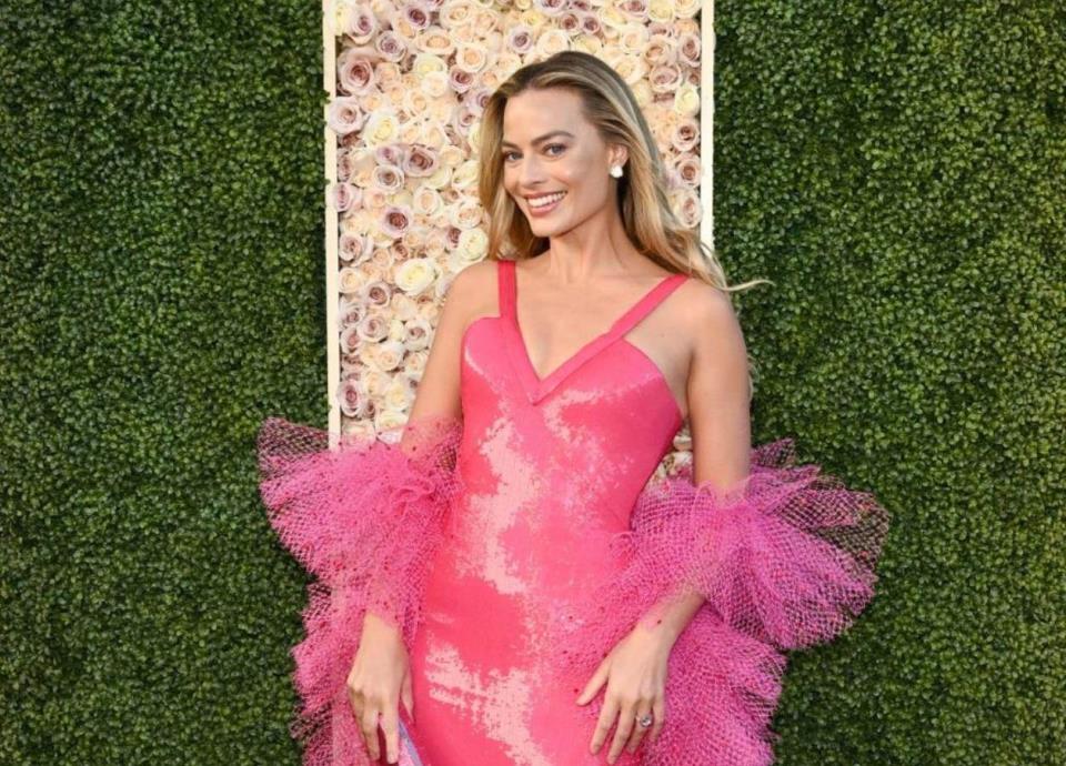 La actriz de 33 años apareció vestida con un brillante vestido rosa que evoca a la muñeca lanzada en 1977 por Mattel y que viste un vestido largo en tono fucsia con una estola en tul a juego en la edición 81 de los premios que se celebran en Beverly Hills, California, en Estados Unidos.