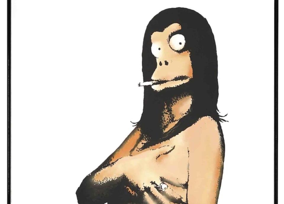 El cuadro caricaturiza la pose de Demi Moore en la icónica portada de 'Vanity fair' en los noventa, en la que apareció embarazada y desnuda, y le añade un elemento de parodia al retratarla con una máscara de mono con ojos aturdidos.