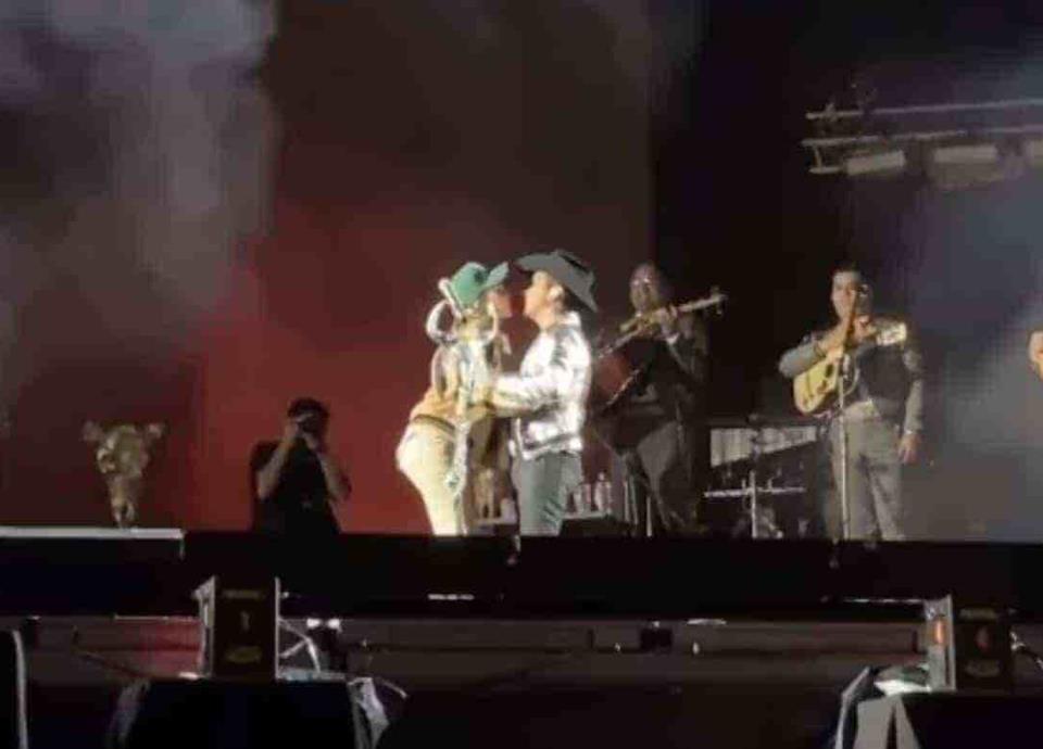 "Gracias por estar aquí con el mejor cantante del mundo", expresó la intérprete de "Sapito" al tiempo que Nodal sonrió y se acercó a ella para abrazarla y besarla en medio de los aplausos y los gritos del Palco Tecate.