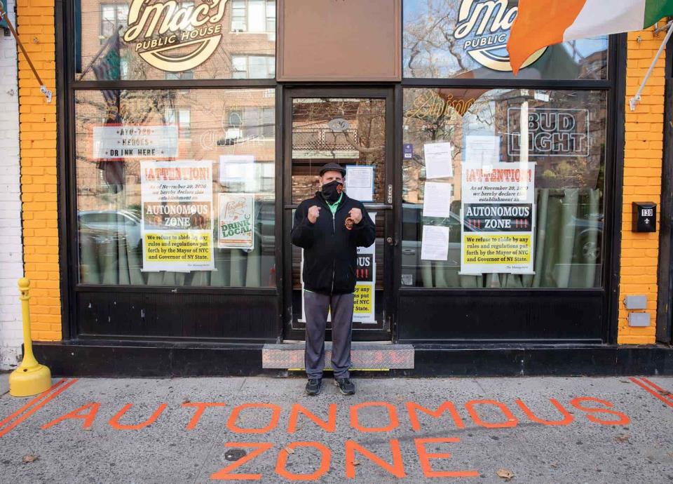 El bar está en una zona naranja —de riesgo intermedio_, designada así por el gobernador Andrew Cuomo debido al aumento de las tasas de COVID-19, y se suponía que no debía atender a los clientes en su interior. Pero los propietarios declararon que el bar estaba una “zona autónoma”, en coincidencia con manifestantes que reclamaron el control de un vecindario de Seattle en junio.