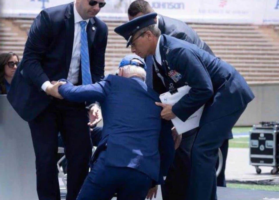 Biden, de 80 años, tropezó con un saco de arena y cayó después de entregar un último diploma a un elemento.