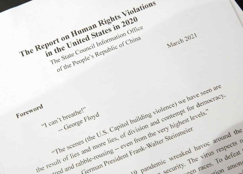 El informe de 28 páginas emitido por el gabinete chino comienza con “No puedo respirar”, una referencia a George Floyd, el estadounidense negro que murió tras ser detenido por policías blancos en mayo del año pasado.