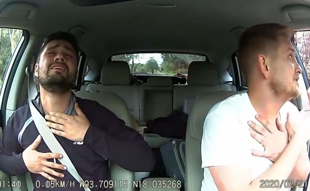 "¡Go, go, go!", grita el copiloto al percatarse que los hombres a bordo de la camioneta están portando armas de fuego, acto seguido ambos jóvenes entran en pánico cuando los hombres armados se acercan a hablar con ellos.