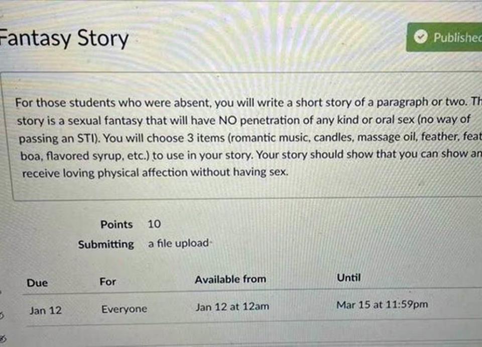 Los padres acusaron al profesor Kirk Miller de haber dejado a sus alumnos que escribieran un relato corto en el que detallaran una "fantasía sexual", incluyendo juguetes sexuales, tal y como se indicaba en un programa de estudios aprobado por el distrito.
