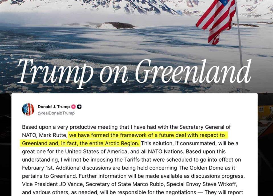 Tras semanas de advertencias de una intervención o de recurrir a medidas económicas, Trump afirmó repentinamente el miércoles desde el Foro Económico Mundial que durante una reunión con el secretario general de la OTAN, Mark Rutte, pactaron "el marco de un futuro acuerdo", cuyos detalles se desconocen.