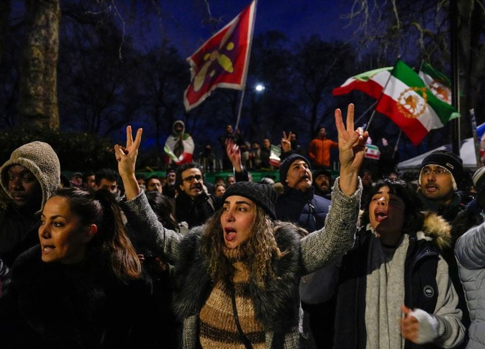 En Londres, un manifestante remplazó brevemente la bandera de la República Islámica de Irán por otra del antiguo régimen monárquico en la fachada de la embajada iraní, durante una concentración de apoyo al movimiento de protesta a la que asistieron cientos de personas, indicaron testigos.