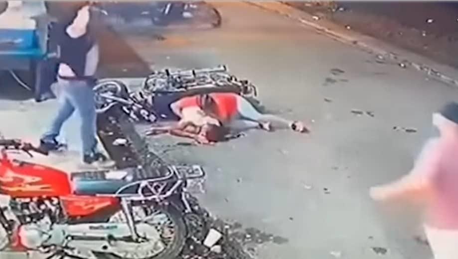 Uno de los sujetos dispara, al parecer por error, y la bala impacta en su compañero que se desvanece en la motocicleta, pues es quien la manejaba.