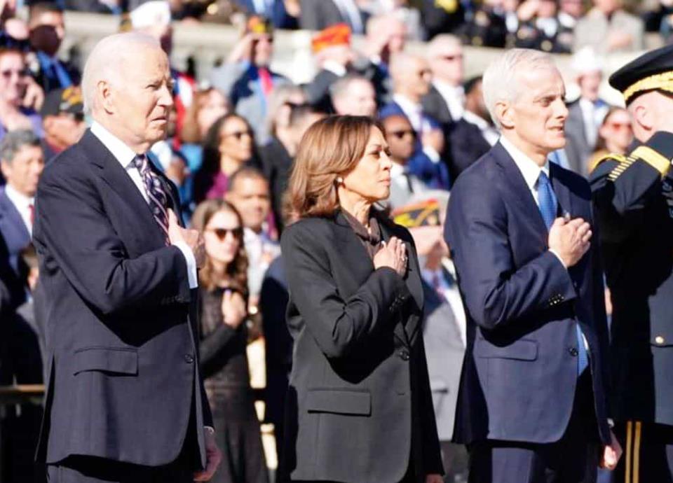 El presidente Biden y la vicepresidenta Kamala Harris realizaron el lunes su primera aparición pública conjunta desde la derrota electoral de ella, al conmemorar el Día de los Veteranos en el Cementerio Nacional de Arlington.