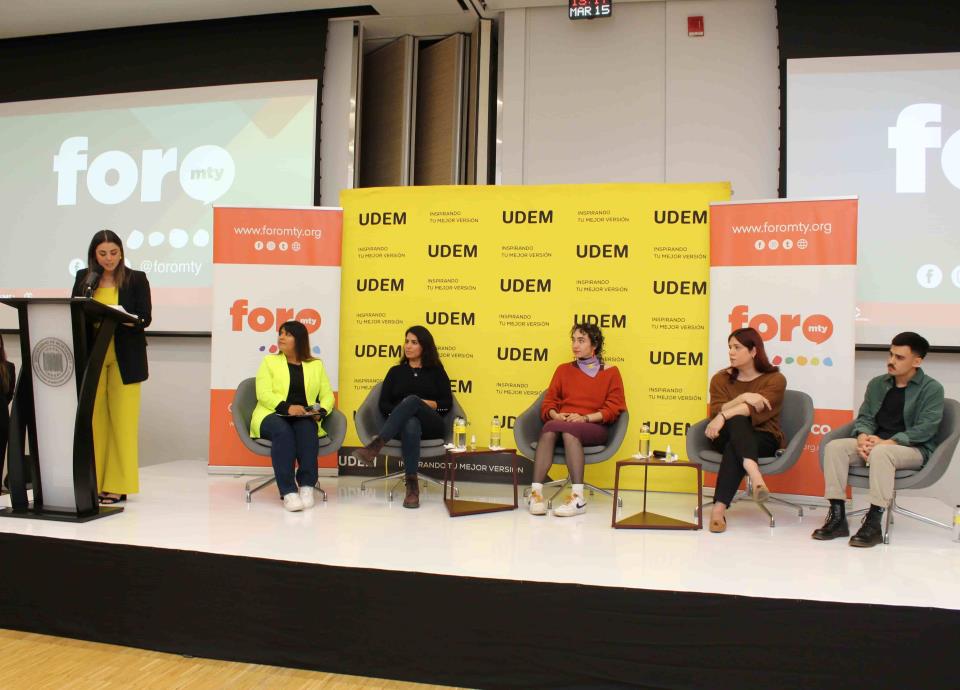 La charla fue moderada por la exaUDEM Alma Ramírez, cofundadora y directora de Unboxed, participaron Alma Carmona, psicóloga e integrante de Zenderio; Myriam Torres, cofundadora de la colectiva Georregias; Carla Escoffié, directora del Centro de Derechos Humanos de la Facultad Libre de Derecho de Monterrey; y Diego Magallanes, integrante del Futuro Florece.