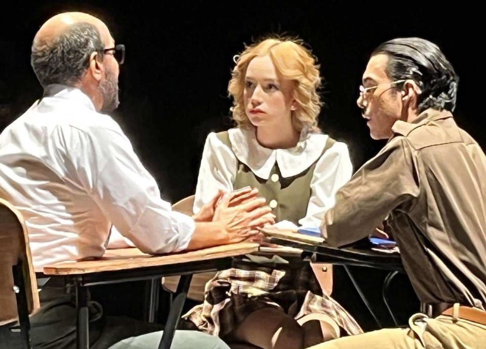 Destaca la disposición escenográfica en dos planos, el aula con sus dos filas de pupitres –a veces colocados en círculo– y un exterior que son los lockers y la biblioteca, mientras una pantalla, en sutil metáfora, proyecta imágenes del nazismo y de las guerras actuales.