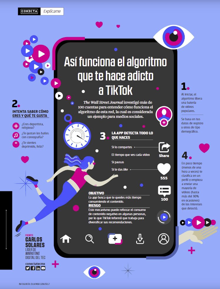 “El algoritmo de TikTok es mucho más agresivo que el de otras plataformas, ves un video y luego luego ya caes en una categoría”, reflexiona Carlos Solares, Líder de Marketing Digital del Tec de Monterrey.