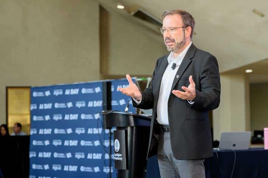 Manuel Terán, gerente de Plataformas de IA en la Vicepresidencia de Transformación Digital del Tec, fue uno de los encargados de hacer la presentación de la versión beta de TECgpt.