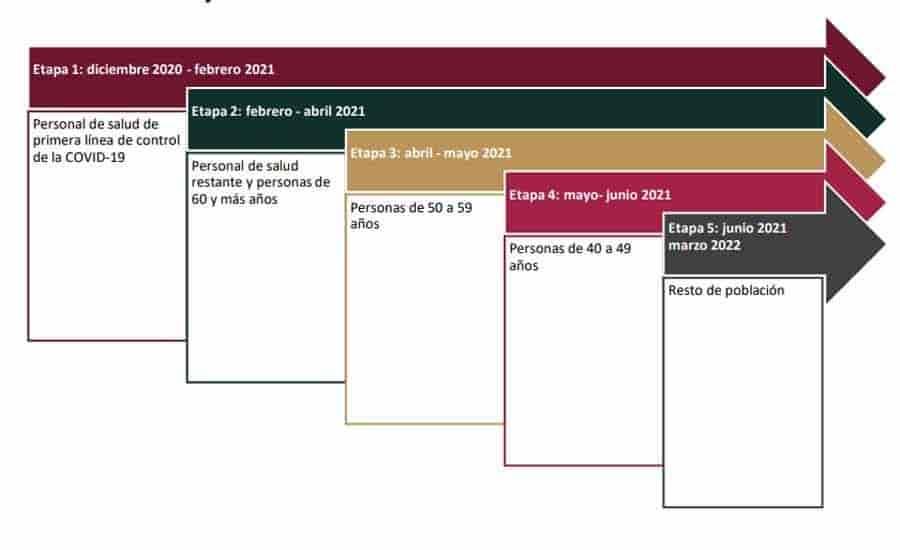 El plan de vacunación para la población mexicana, que será gratuita y universal, fue dividida por etapas, de acuerdo a grupos poblacionales.