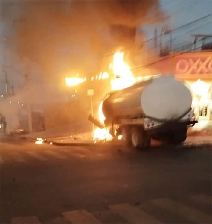 Tras el fuerte golpe la unidad que llevaba agua, comenzó a incendiarse alcanzando a una camioneta la cual estaba estacionada.