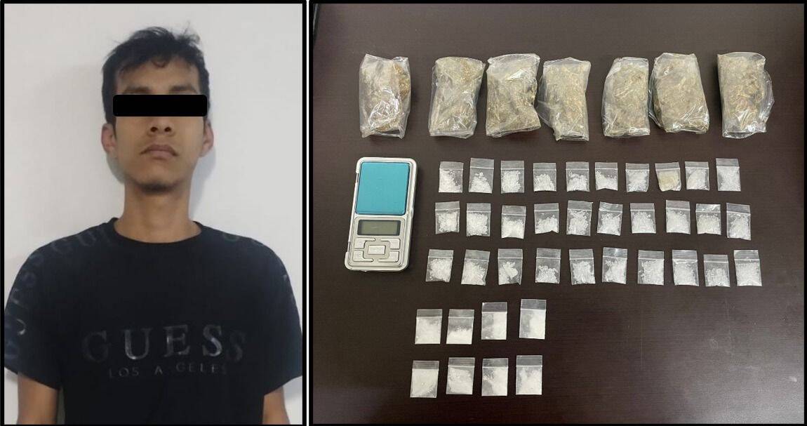 El detenido se identificó como Daniel "N", de 22 años, a quien se le aseguraron siete envoltorios con hierba con características similares a la marihuana, ocho bolsas con aparente cocaína, 30 dosis de una sustancia similar al cristal, una báscula digital y la motocicleta.