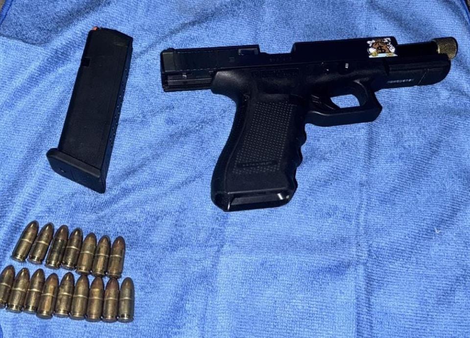 Al ser revisado, se le localizó un arma de fuego tipo escuadra Glock calibre .9 milímetro, con 16 balas y fue detenido por la portación de el arma, además de asegurar el automóvil por el estado de ebriedad con el que conducía.