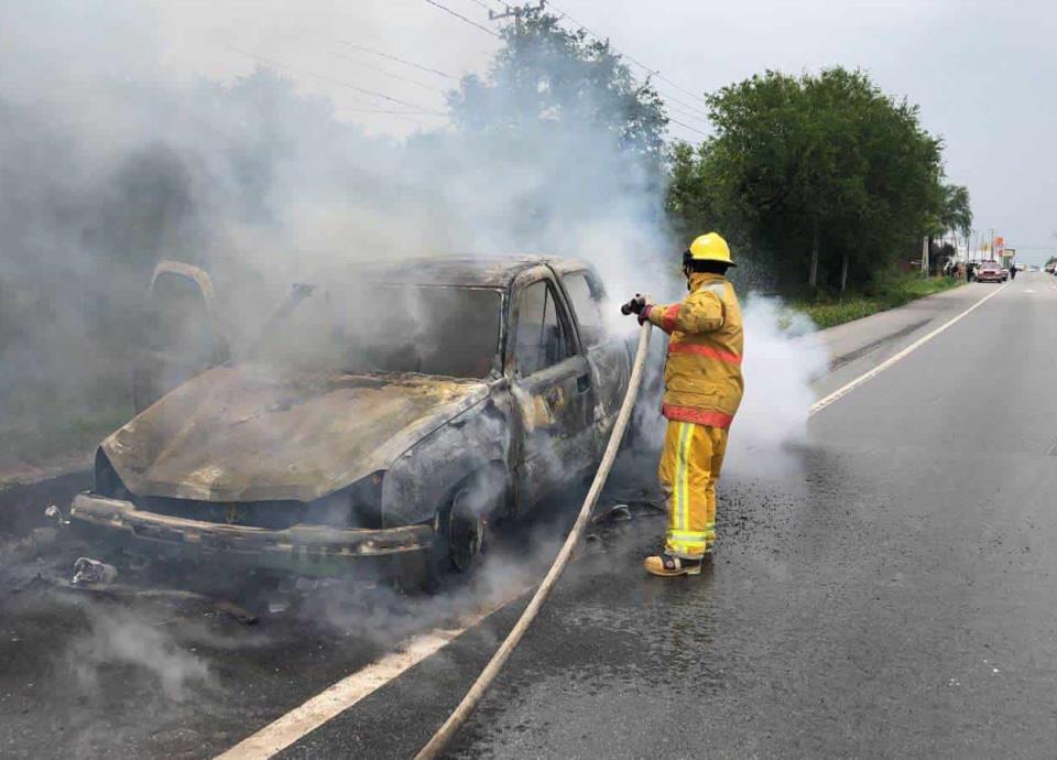 Una camioneta de modelo antiguo terminó totalmente destruida, al incendiarse cuando se desplazaba en la Carretera Nacional, en el municipio de Montemorelos.