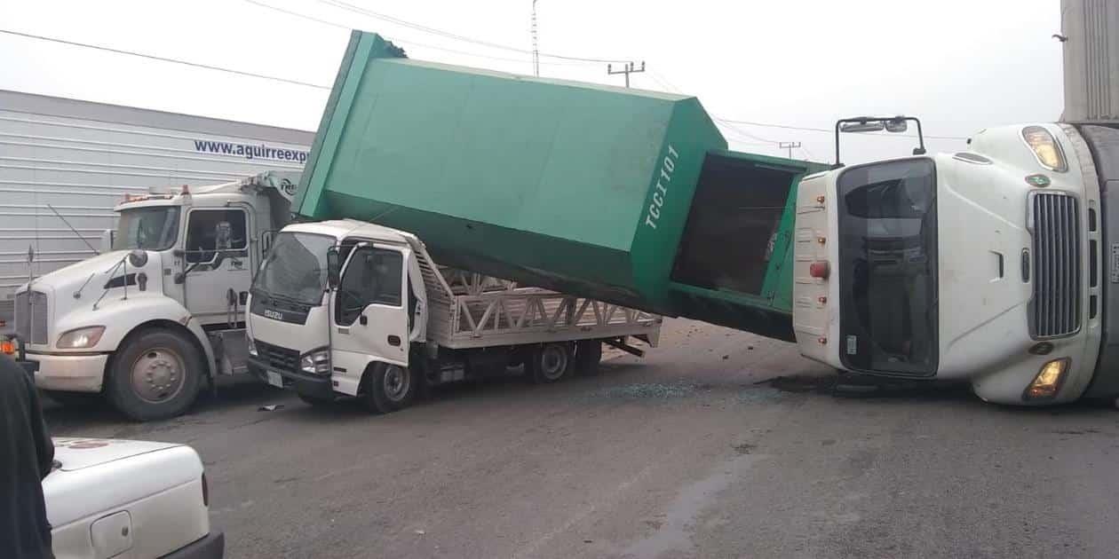Durante el accidente tipo carambola, el pesado vehículo golpeó una tolva, que terminó encima de una camioneta compacta