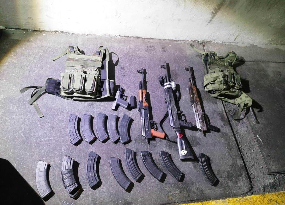 Asimismo, se hallaron un arma corta calibre .9 milímetros con cargador; tres armas largas tipo AK-47; 14 cargadores de arma larga y tres chalecos antibalas.