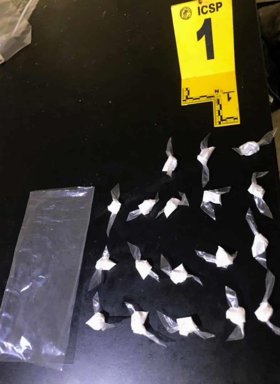 En el lugar se aseguró una bolsa de plástico transparente, con 18 envoltorios con polvo en color blanco en su interior, otra con 30 envoltorios con sustancia sólida color blanco en su interior.