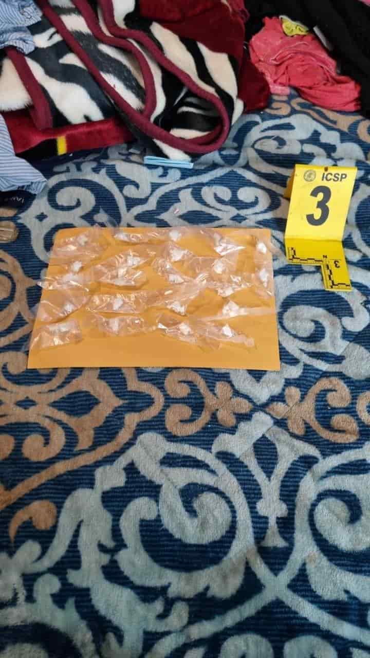 En la revisión efectuada por las autoridades, se aseguró una bolsa tipo canguro en color negro, un gafete, una báscula digital en color negro, un celular color gris con la leyenda Iphon con protector en color negro, un celular en color negro con protector en color negro y rojo, dos envoltorios con cocaína y 63 con cocaína en piedra.
