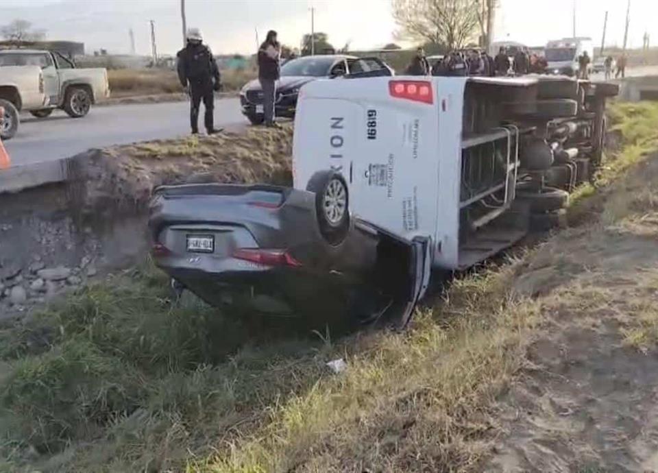 Al menos siete lesionado dejó el choque volcadura entre un transporte de personal y un vehículo particular que terminaron en un canalón, ayer en la Avenida Concordia a unos metros de su cruce con Miguel Alemán, en Apodaca.