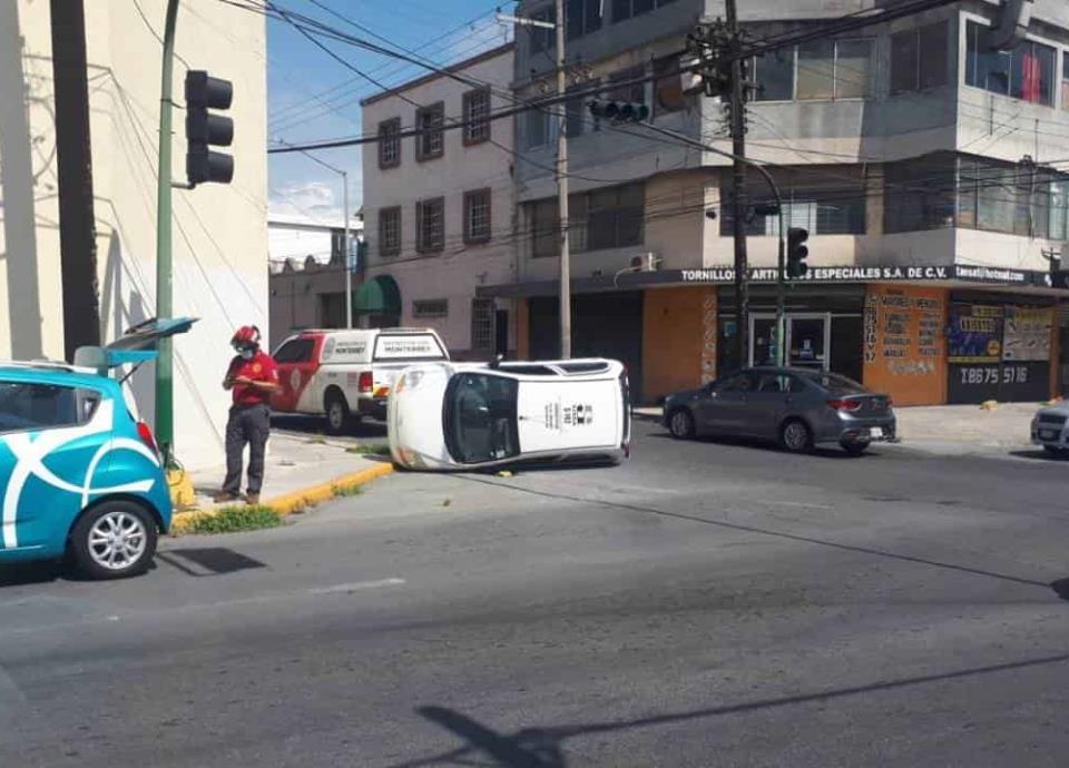 Monterrey N.L.- Dos lesionados y daños materiales dejó esta mañana un choque volcadura entre un par de vehículos en calles del centro de Monterrey.